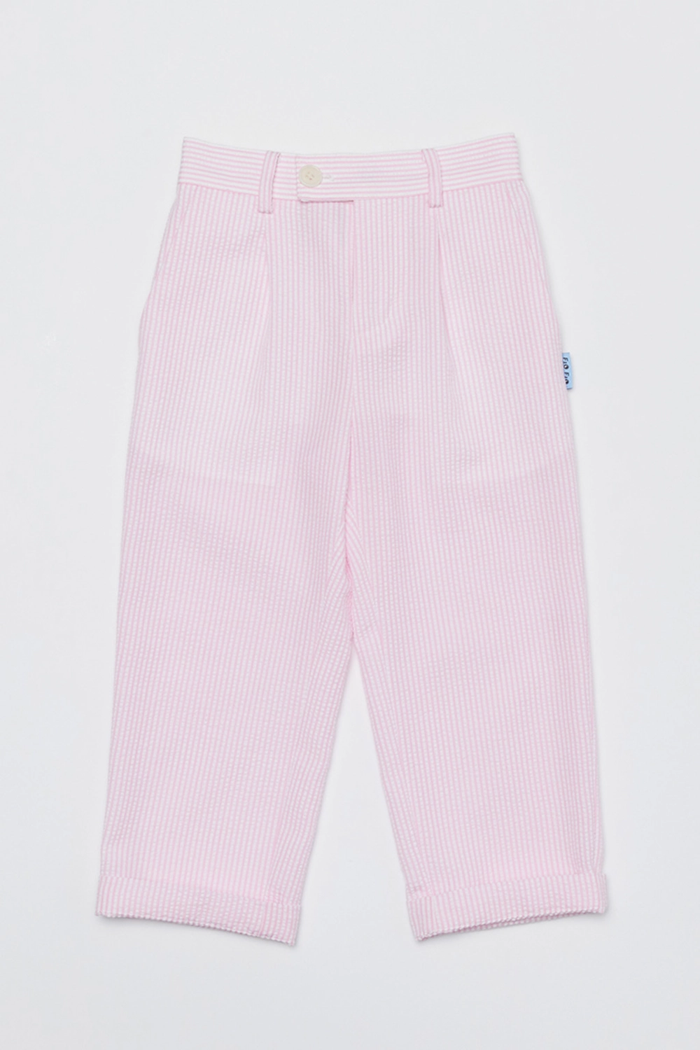 시어서커 수트의 팬츠 입니다. 배기 스타일로 맘 핏 이라고도 하는 디자인 입니다.
